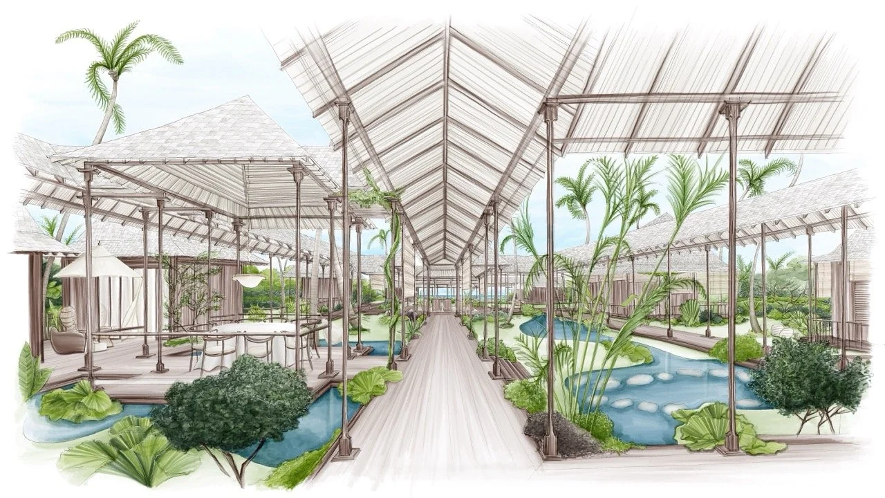 The masterplan is divided into a series of individual dwellings from private guest suites to dining pavilions, all connected via a network of loggia’s & pathways through gardens and across natural water pools & ponds.