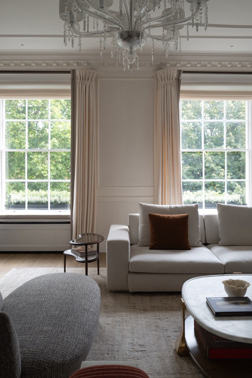 New window treatments including dress curtains, privacy blinds and blackout blinds were all meticulously handmade in London by master craftspeople, using the finest Italian fabrics & trims.