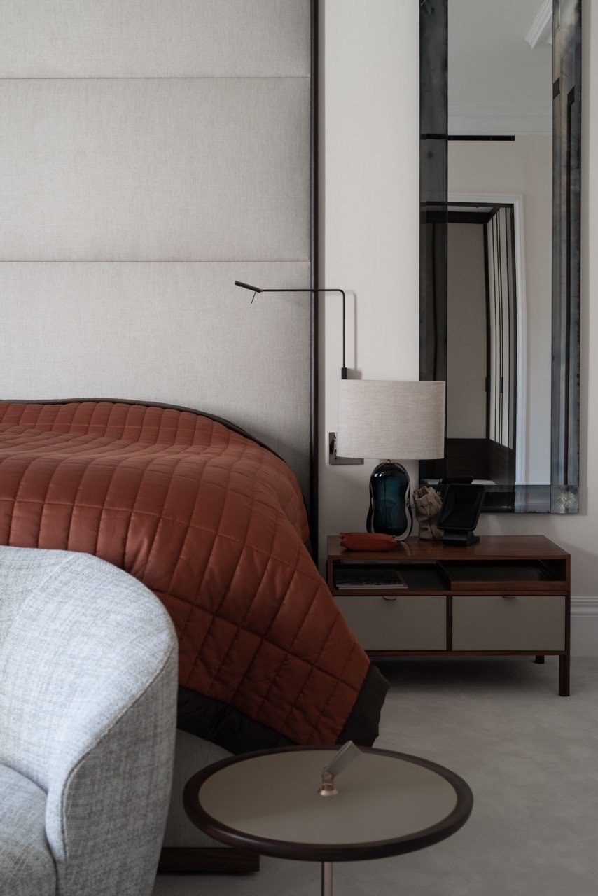 The lateral layout of the apartment remained relatively unchanged however, a full re-planning of bathroom layouts and dressing rooms was undertaken alongside replacement surface finishes and soft furnishings to all areas.