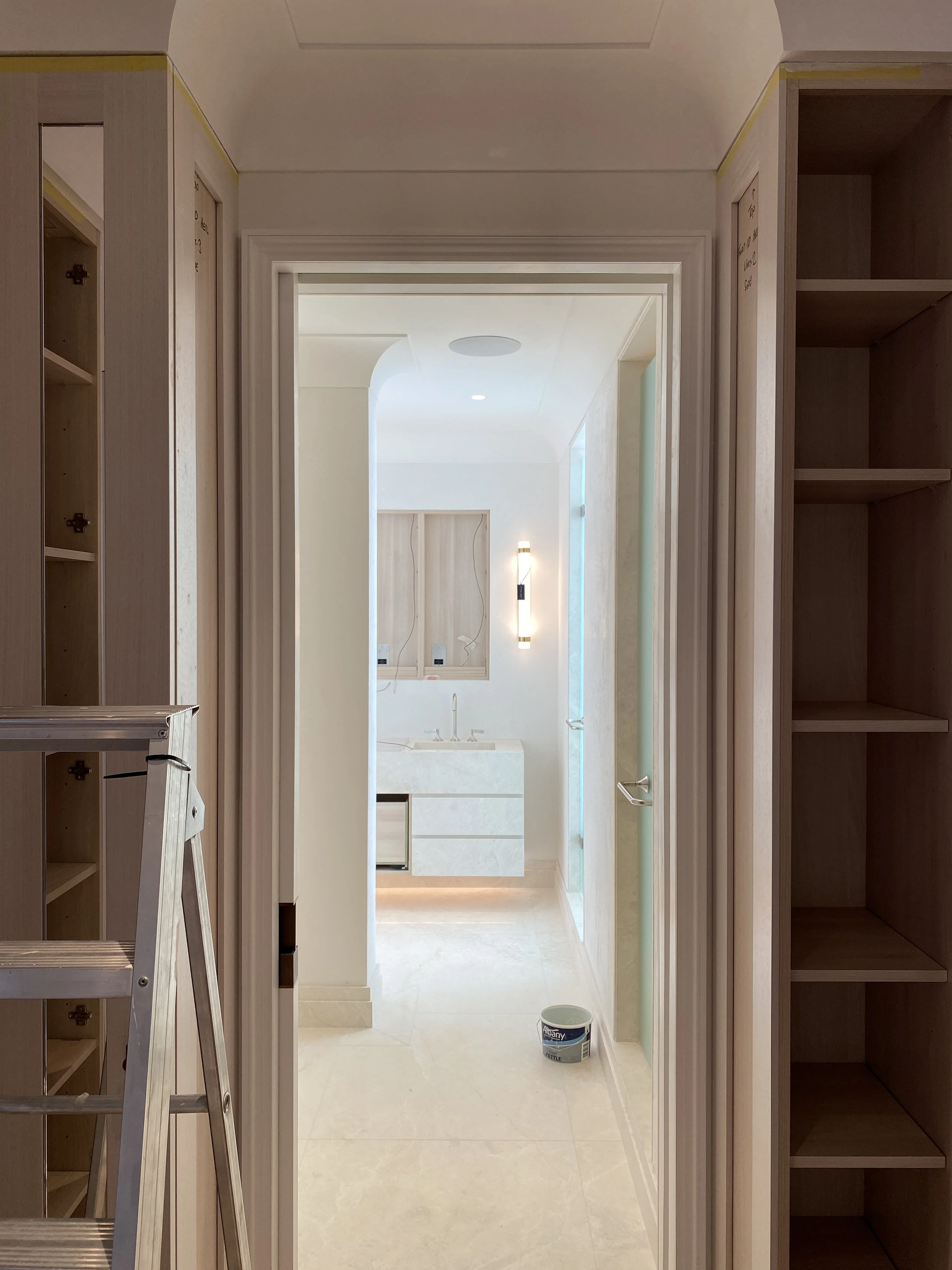 Coved walls and a large contemporary cornice mimic the communal stairwell running through the building, with arched openings creating small vestibules for art and separation of space. A pair of concealed openings are introduced for symmetrical composure and a balance of proportion between main living areas, with a discreet archway through to sleeping spaces at the rear. Modest detailing adds a humble richness to bathroom stones, bringing a sense of warmth in the materials as bright light passes through meticulously restored sash windows. Textured plaster creates depth and movement with contrasting lines for balance and division of lengthly hallways - becoming a secondary framing for a varied collection of artworks.